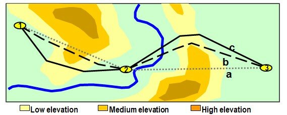 In the second method, no predefined alternatives are provided, however a computerised optimisation is carried out to determine a so called least cost path. Such a path is generally based on the evaluation of all (usually thousands) possible routes through a landscape of costs (or benefits) that are based on particular criteria. This may be similar criteria as applied in the first method and in principle also here stakeholder input may be part of the process. We will also discuss this method in this section.