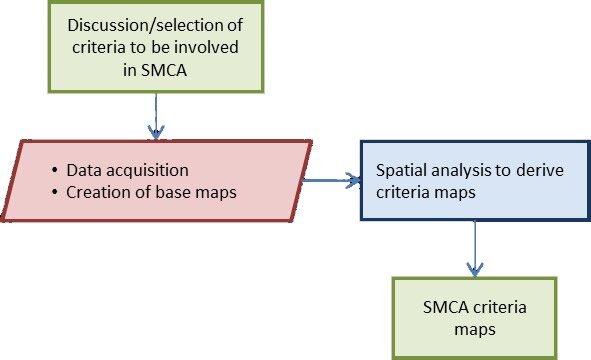 A lot of the information that needs to be collected will come in the form of maps, such as the items mentioned under 1,2,3, 4 and 5, others may also come as not spatial criteria in the MCA, although they will always have a spatial component, e.g. 6, 7 and 8. In carrying out the SMCA we can also incorporate the non-spatial criteria, depending on the software that we use for this purpose.