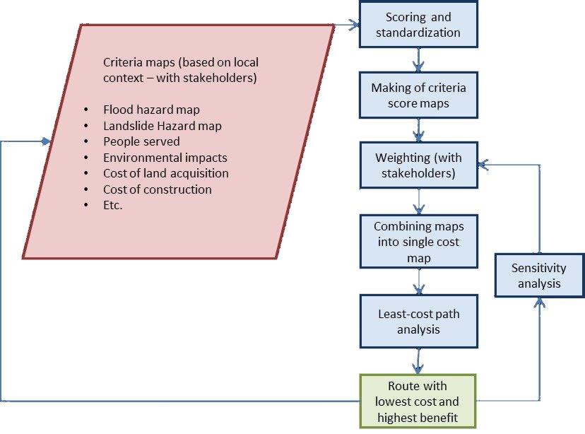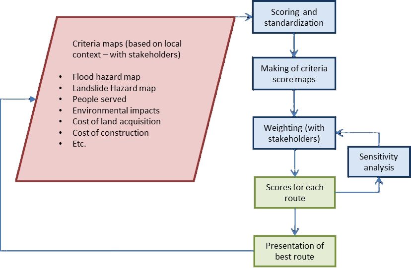 As can be seen from the flow-chart, the methodology can be used iteratively, where in a second iteration other criteria can be added, or changes to criteria maps can be made based on potential interventions, e.g. to reduce the hazard in a certain location through structural measures.