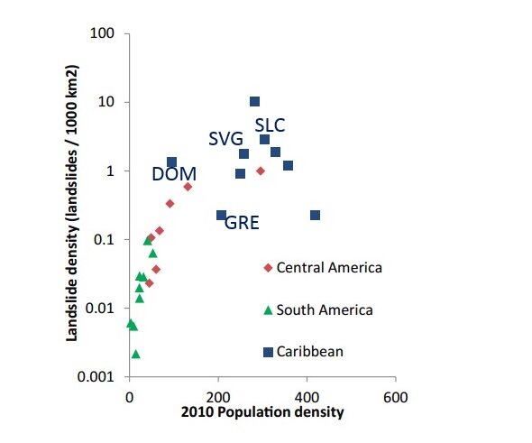 Figure 4: Landslide density versus population density per country (Sepúlveda and Petley, 2015), with indication of Dominca (DOM), Saint Lucia (SLC), Saint Vincent (SVG) and Grenada (GRE)