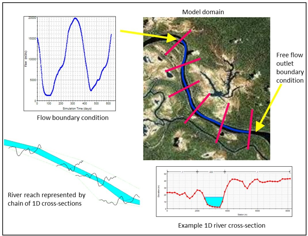 Often the model domain is a subset of a river system, for example, you might only model a 1-5 km reach of a river for a bridge design model. This means that for the model to run correctly, it will need to know something about the conditions outside the model domain, because rivers are continuous systems flowing from the hills to the sea. These outside conditions are known as boundary conditions, and usually consist of water levels or flow inputs at the edge of the model domain. Often the availability of data at particular points on a river, e.g. river gauge location, can help define the choice of model domain area.