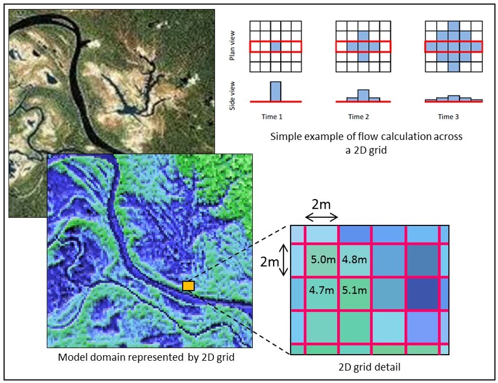 In the last ten years, 2D fluvial modeling has become much more common (see figure below). It has been made possible and popular due to the increasing speed of computers and methods of collecting detailed topography such as LiDAR. This form of model allows a more detailed calculation of “out of bank river flow” over the river floodplain, by treating the earth’s surface as a series of gridded squares each with its own elevation and calculating how water would flow across this grid. Sometimes models incorporate both 1D and 2D components to allow the best representation of both the river and the floodplain.