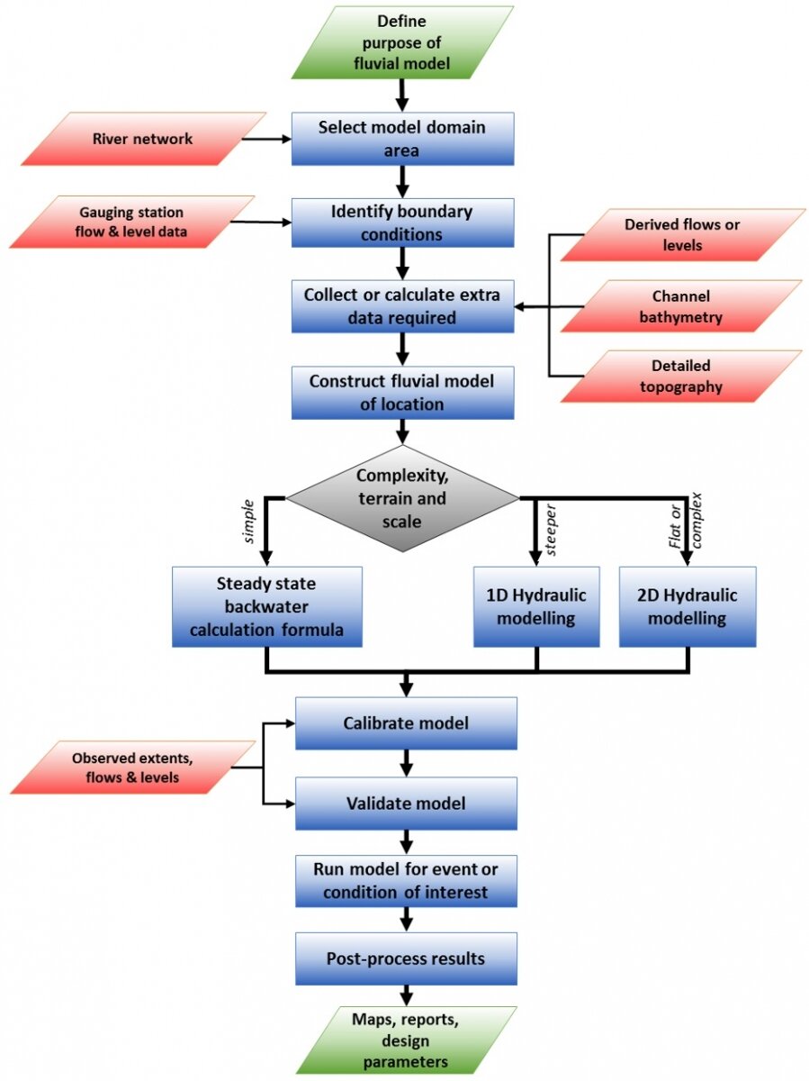 There are many steps and decisions to be made in building a fluvial model. The main steps are shown in the figure below and described below: